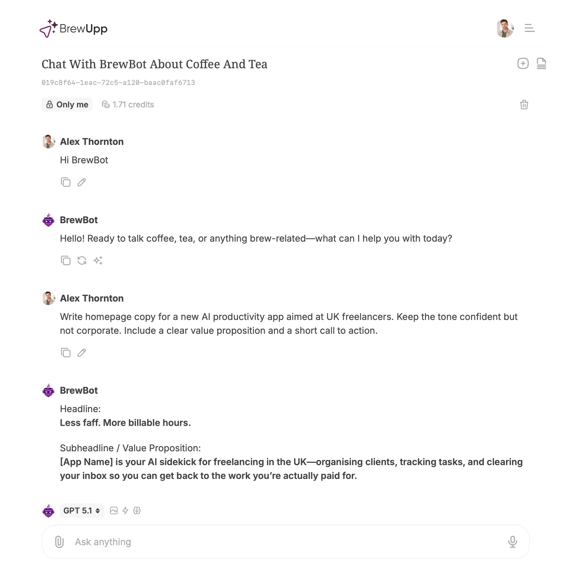 Talk through ideas, outlines and drafts in natural conversation with BrewBot.